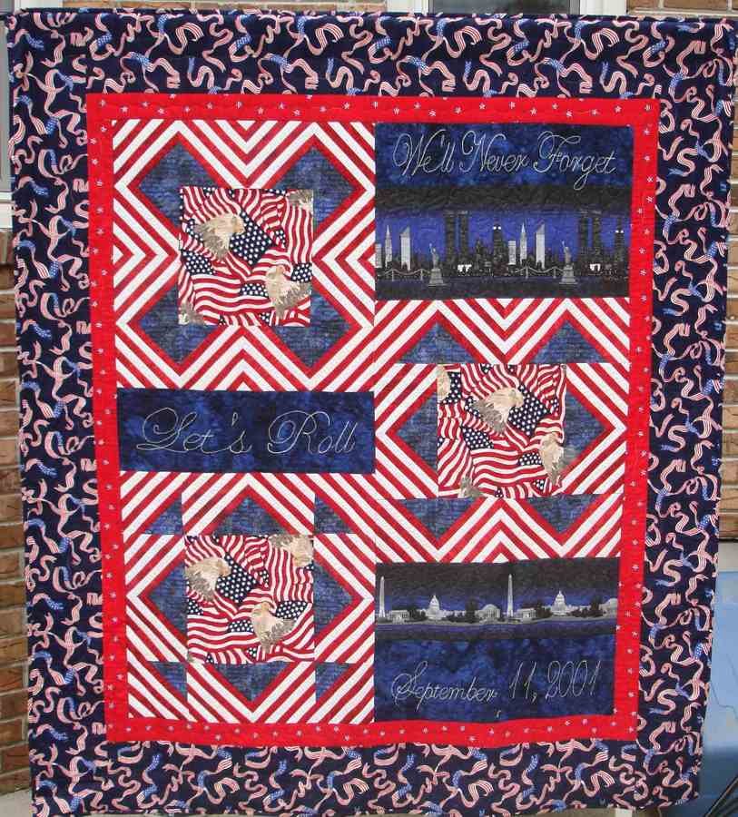 pamo65 We'll Never Forget - I made this quilt for the first anniversary of 9 11. I had fabric that had NYC with the Twin Towers and Washington, DC. To commemorate the third site, I used the term "Let's Roll". I used bobbin drawing (that I learned from Libby Lehman) to do the writing. It was displayed at the Veterans Affairs Medical Center in Charleston for the first anniversary of 9 11.
