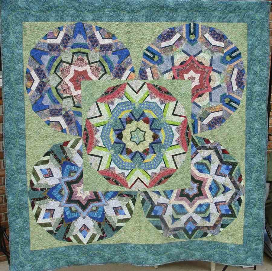 pamo65 Kool Explosion - This was begun when Ricky taught the Kool Kaleidoscope class in Charleston. I wanted to make mine larger and he suggested that I put partial kaleidoscopes in the four corners. It took several years to find the right border fabric. It was quilted by me on my Viking Sapphire in a custom designed table. I used my favorite thread--Superior, of course. I used Rainbows(802, 836, 831, and 841 with Art Studio 110 and Highlights 748 in the border. I used Masterpiece 154 in the bobbin. It is bound with piped binding.