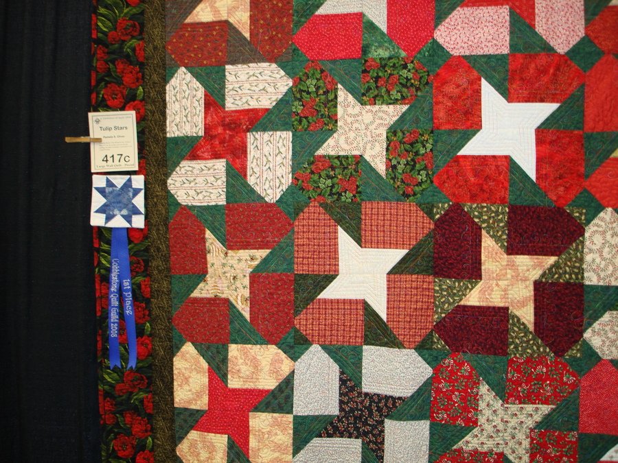 pamo65 Tulip Stars - I won the BOM at my guild in July 2007. I did not want the quilt to shout Christmas so I bordered it with tulips on a black background. The quilting is improvizational. It is completed with piped binding.