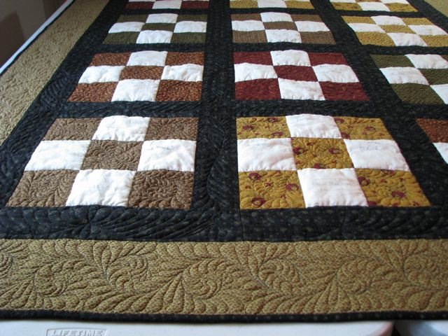 | Design Source - Description | This is my very first commissioned quilt and my first attempt at free motion feathers. Many thanks to Ricky Tims and Diane Gaudynski for their inspiring works. |