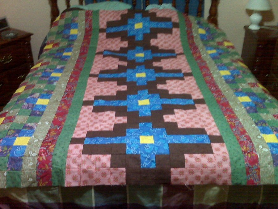 ambrosia not named - I wanted this quilt to have a southwest feel to it. I really like how it turned out. The measurements are approximate, because I forgot to measure. I quilted it using a solid red back and binding and stitched in the ditched on all horizontal and vertical seams. It's being used on a twin size bed.