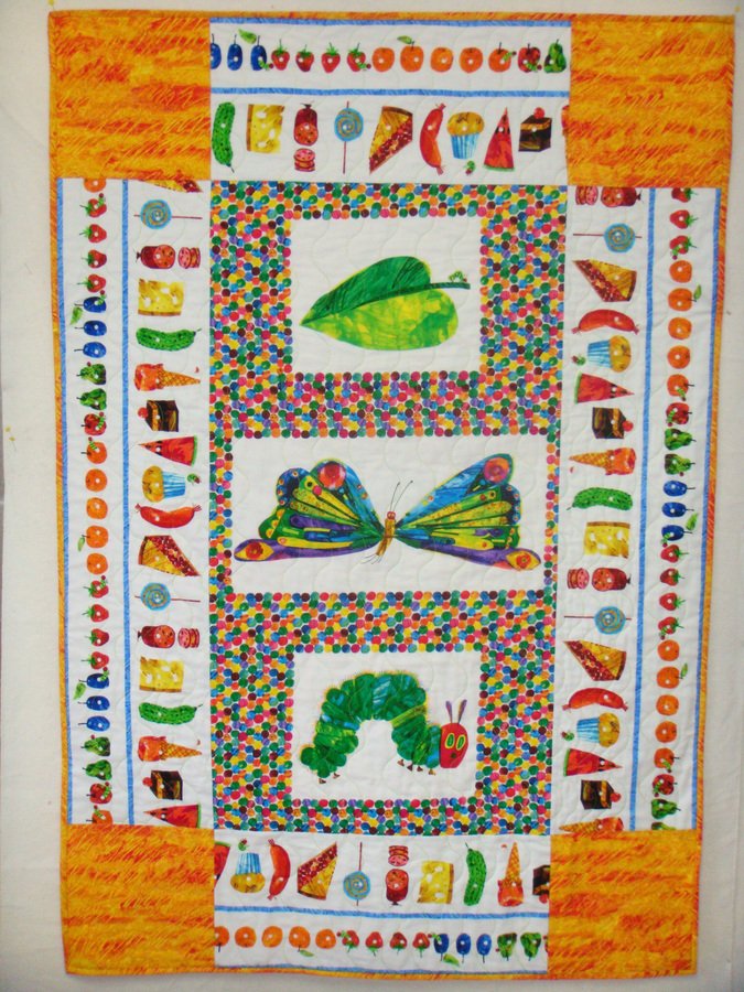 MCapps1999 The Very Hungry Caterpillar - Front and back panels with 10 inch square corner blocks & 10 inch wide borders. Butterfly quilting in all four corner blocks.