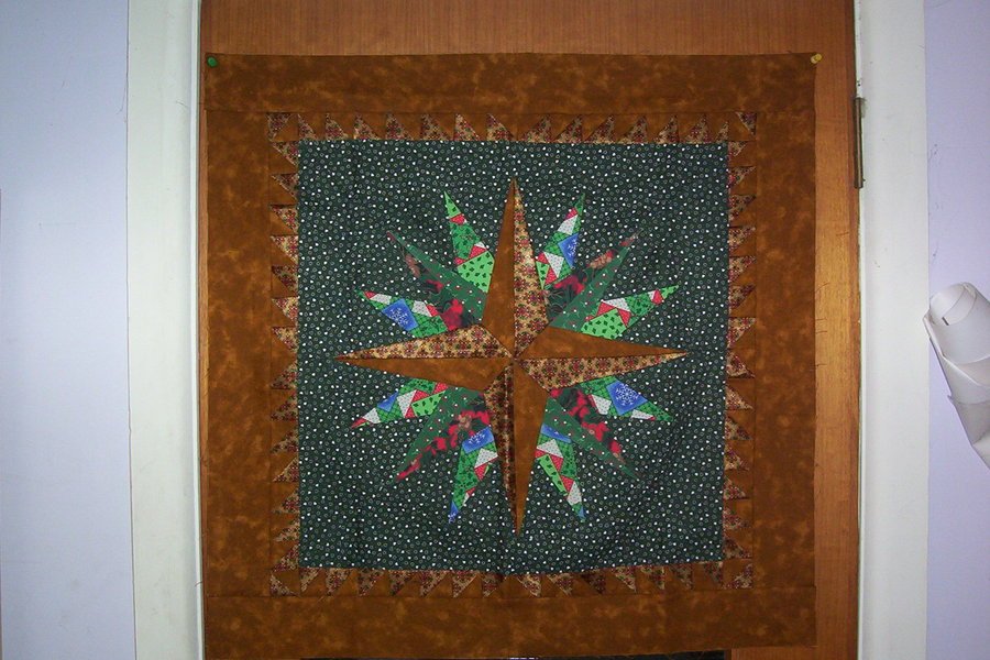 victoriaedm Xmas mariner"s compass - I originally made this for christmas 2008, but was noy happy with the metallic thread in the quilting, so I have unpicked, rebacked and requilted it for this year. The main fabric is a shiny gold chrismas fabric which I had been saving because I loved it (as we do) and finally decided to use in this pattern when I saw brenda henning on TV.