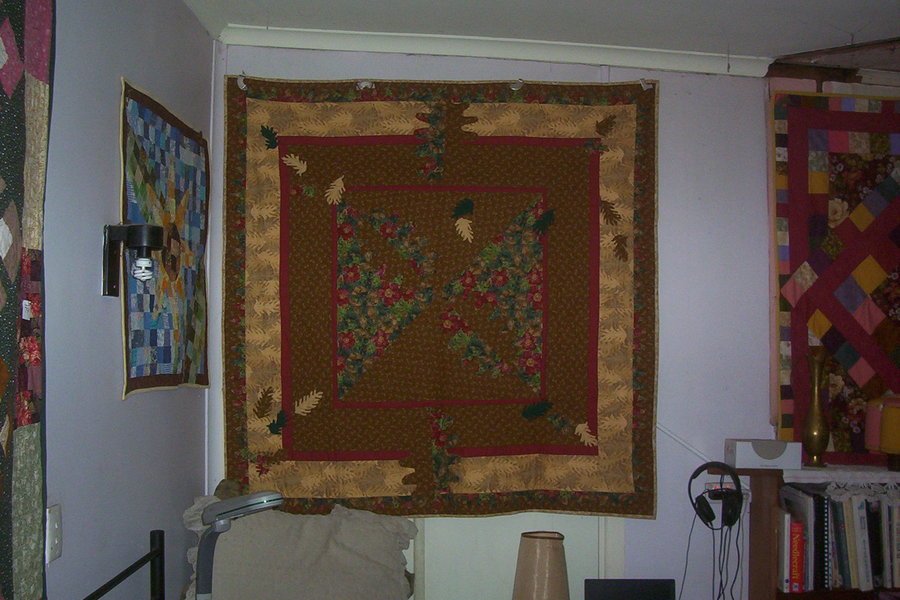 victoriaedm Autumn Leaves - This quilt is a design which I just thought of after purchasing the fabric. The one with the red flowers was the main inspiration. the theme is oak leaves, so I appliqued the large leaves in alternating fabrics in the centre. There are also some smaller appliqued leaves scattered and a scalloped piece in the outer border. The quilting was done in the ditch on my home machine and there is some freehand long arm stippling in the large open areas.