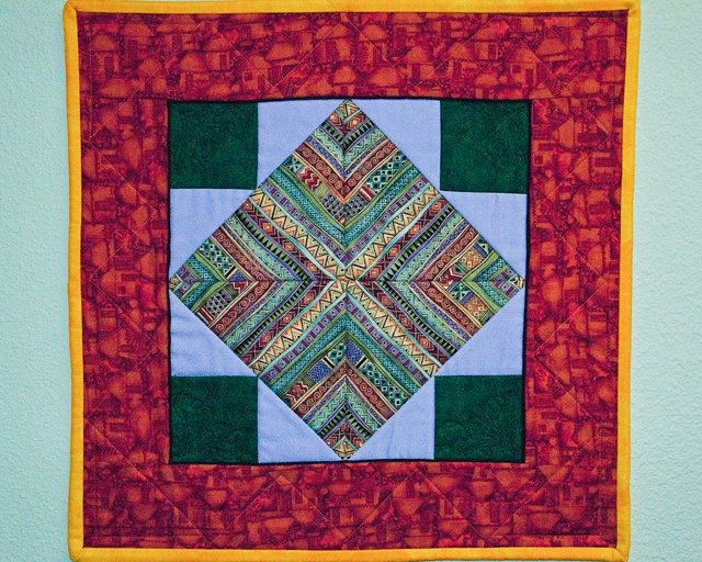 KTDesigns Africa - I wanted to a small quilt using the fabrics that reminded me of Africa; thus, the name of this mini quilt Africa. I found the Art Block pattern by Jinny Beyer and it seemed to work well for my purpose.