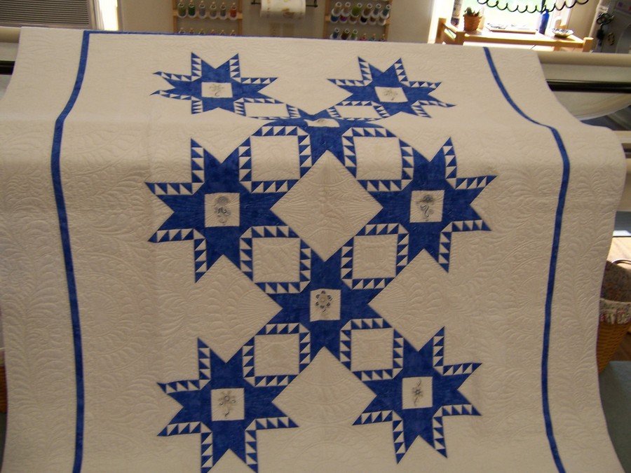 VickiAnnToria Feathered Ice - This was supposed to be our show quilt for 2007. It finally made it in late 2008 and 2009. The piecer is Jeri Mace. She sure does nice work. Not the best picture but best I have so far.