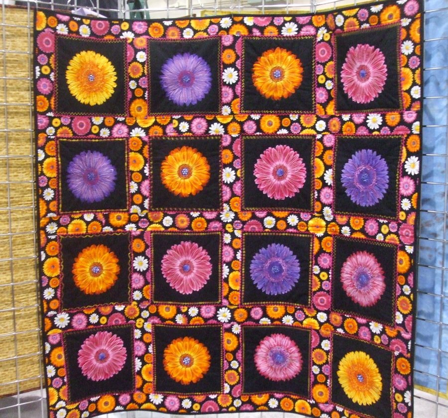 etafrica Midnight in my garden 1 - I wanted a bright floral quilt for a series I am making called "Midnight in my garden". A friend found the fabric which came in different size flowers. I bought 3 different fabrics in the same line and made a traditional block & sashing quilt using 2 of the flowers sizes for this quilt. Quilt is machine pieced and quilted with heavy machine decorative stitching and free motion quilting. Hot fix crystals & beads have been added to flower centers.