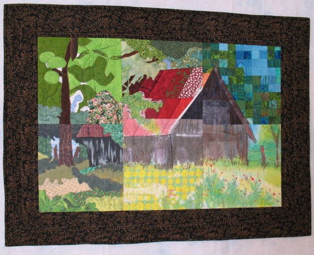 marbles Red Roof Barn Slice Quilt - The "Slice Capades"is a group from our local guild, and this is our group's first attempt at a slice quilt. Six of us (Judy Nigh, Jeannette Larson, Lyn Anthoney, Suzanne Koenen, Nancy Hamilton, and Judy Lorino,clockwise from top left) were given 1/6 of an enlarged copy of an original watercolor by Suzanne Galli Koenen, and replicated our piece six times using whatever technique we chose. We exchanged our finished pieces and then had all six to make a complete copy of the original. We then combined our six pieces into a quilt, and those that were completed in time, were shown together at our Quilt Expo 2009 held this past March.