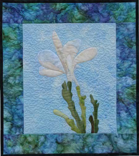 | Design Source - Description | This is an original design based on the the frangipani flowers we have growing in the garden. I hand painted the background fabric and then created the design using invisible machine applique and commercial batiks. |