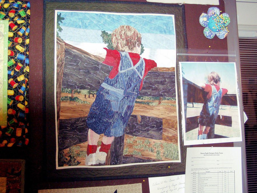 donnagayle No Bull - This is a wall hanging I made from a photo (next to quilt) of my grandson climbing a fence to see some of his father's bulls. While tracing a photo of some of their bulls to put in the background, I had an interesting conversation with my grandson about bulls and decided I better not put a bull in the background because I might omit a part of its anatomy. This is why the title is No Bull. It was appliqued down with lots of thread play on it. I have since given it to my grandson to hang in his bedroom on their ranch in Winnie.