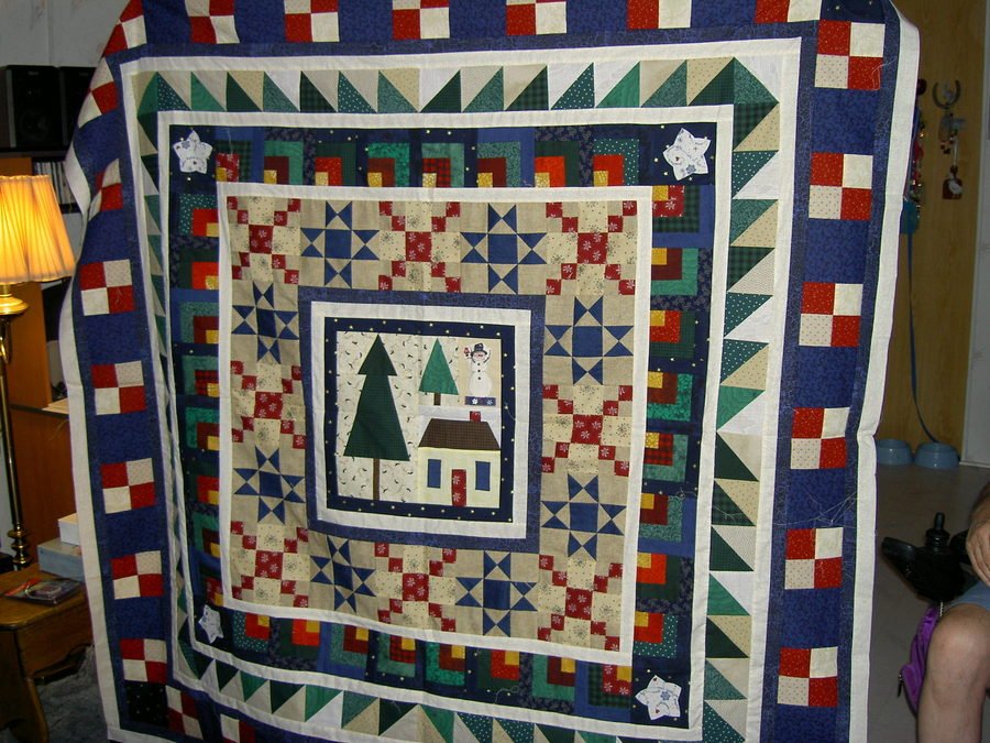 BeckyA Denise's Christmas Quilt - My sister took this class a long time ago. Quilting was not her "cup of tea". She completed only the very center. so, she sent me all the pieces - she had already cut all the pieces for the entire top. I read through the directions, sorted out all the pieces (like a jigsaw puzzle) and completed it for her. It is not yet quilted. For all I know, it could have put it together incorrectly per the intended (especially the log cabin border), but I don't think it matters at all. It now has my personal touch.