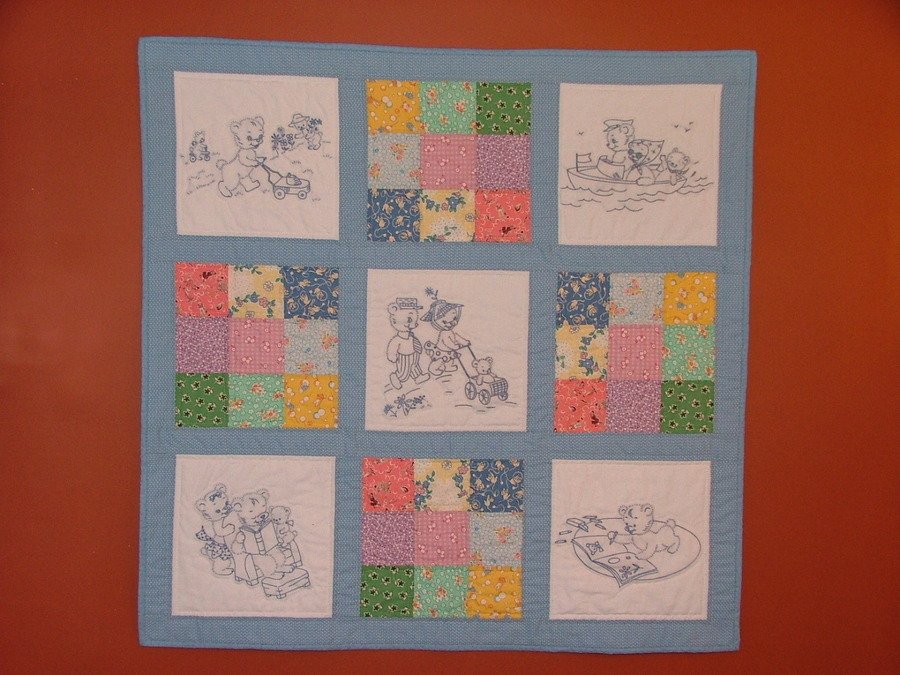 JulieinDerry Teddy Bear Family - The quilt itself is my original design but the embroidered squares are from the Aunt Martha's Iron-On Transfers. I made this one for my third child, Brooke. Size is approximate.