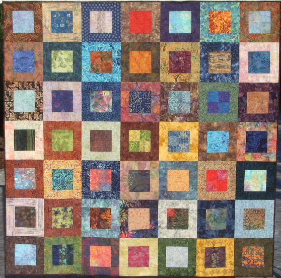 FluffBallQuilts Bright Hopes (second one) - Quilt made for second grandson (a tween) as he also felt he had outgrown his cars and trucks quilt. Embroidery machine quilted using a multi hoop design.
