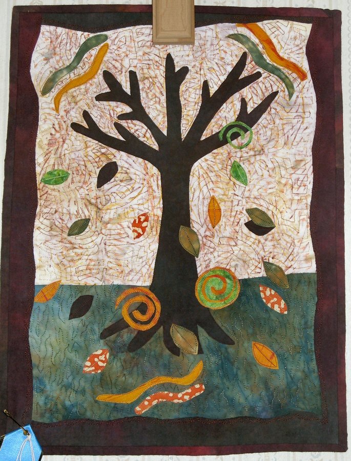 | Design Source - Description | I was just playing with this small piece, I had painted the background fabric with Shiva oil sticks and it looked likes leaves in the wind, so the fall tree had to be planted. Just For fun!! |