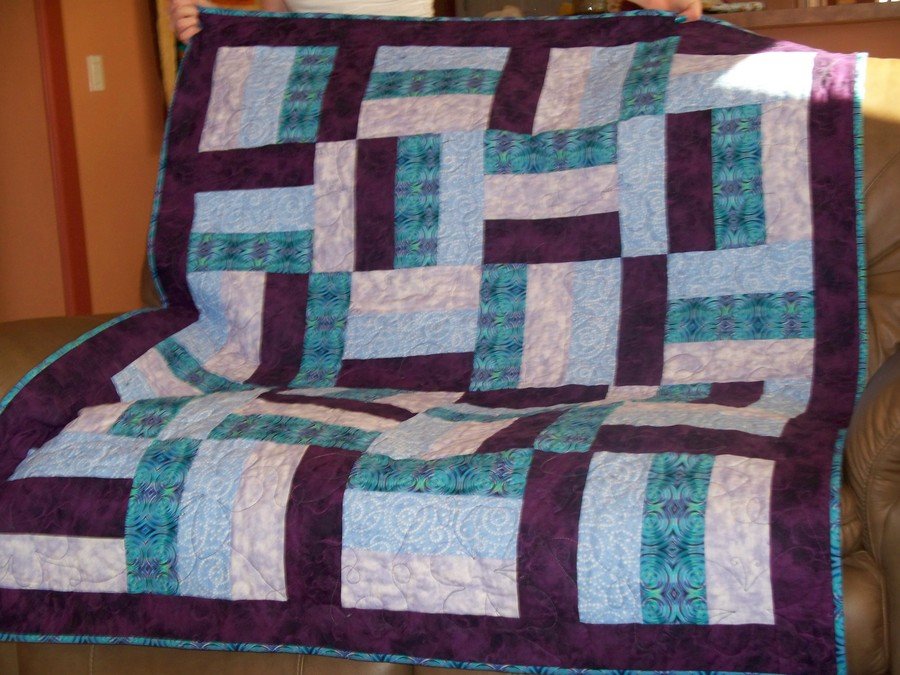 StitchinRN Caitlyn learns to sew - Caitlyn came to AZ for a week before school started. She wanted to learn to sew. We went to the local quilt store and she chose the beautiful puple, blue and white fabrics. Then the process began. We washed the fabrics, ironed them and learned to work with the rotarty cutter ( lots of oops- but we managed). Sewing 1/4" seams -some not so 1/4, but mostly they were. Caitlyn made great strides after 'getting the hang of it' and when I came home from work one day, she had already finished 2 complete rows and had them hanging on the design wall. We completely finished the quilt at the very last minute before she walked out the door to go home. I had a great time helping her and seeing her joy with the completed project.