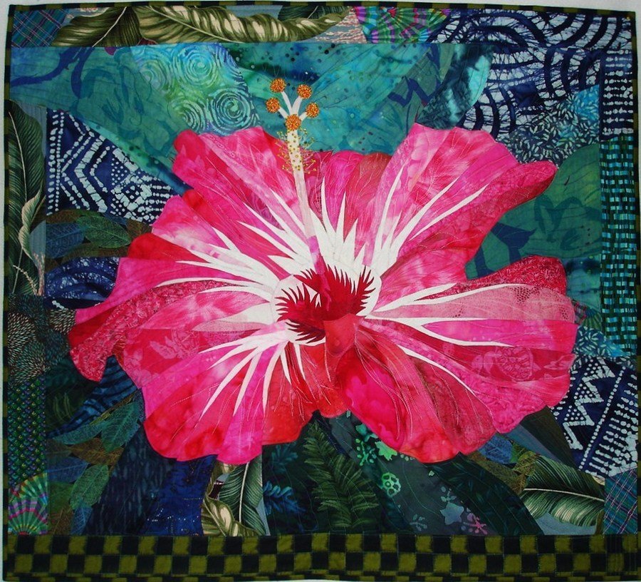 | Design Source - Description | My pink hibiscus was drawn from a photograph that I took. I sketched the flower, then drew the pattern. The center of the flower is fused, but the remaining is machine pieced and quilted, with beading details. |