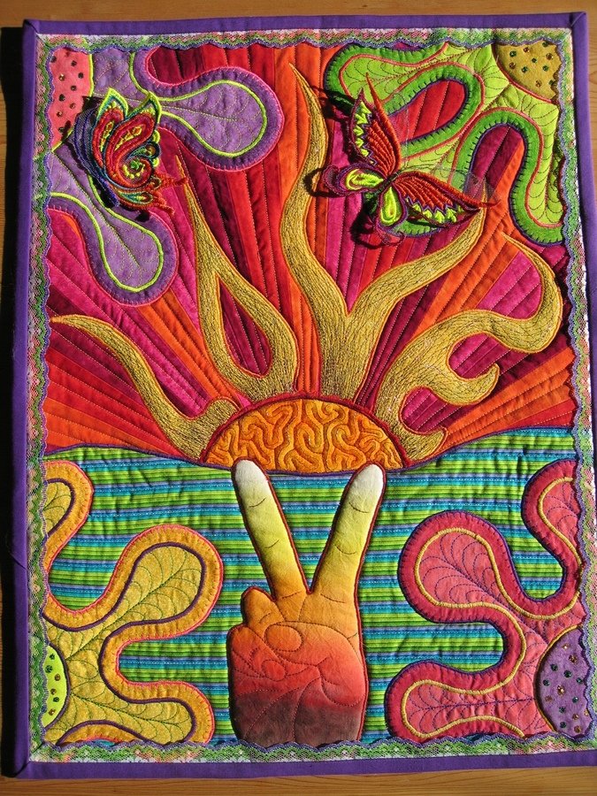 PatDaniels Love Is All You Need - In this quilt I used LOTS of Sulky Sliver threads, fabric markers, sparkly paints and even some lace. The peace sign is a rendering of my own hand - my right hand - I'm right-handed. Don't ask me why I didn't draw my left hand. I'd look at my hand, then pick up the pencil, then put it down and look again and so forth til I was finished. It never occurred to me to draw my left hand! The colours on my hand refer to the First Nations people here in central Canada. When they have a big celebration they will put a tiny sign depicting 4 stripes at the side of a grid road. These colours refer to the races of man - we are all invited. Instead of using delineated stripes, I let my colours blend into each other - we are all one people.