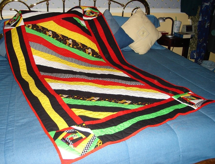 seabatfamily Indy Gras - This is made to thank Terry and her family for lodging us for the Indy 500 every year. The colors are traditional race colors with a Mardi Gras print thrown in since we bring crawfish each year and have an "Indy Gras" party before the Race each year. A second similar quilt was made for Terry's sister, Tammy, my husband's cousin's wife.