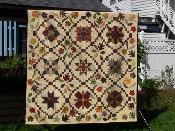 denise-nh Jackie's Moondance - Moondance, pattern by Beth Ferrier. Started in 2004 and decided to finish it last May. Had about 70% of the piecing done, had to finish the blocks and do all the applique. It was machine quilted on a long arm by Nancy Tatro from Finely Done Quilting, Candia NH. This was a gift for my SIL’s 60th birthday. Another UFO done! Oh, she loved it by the way, gave it to her last night, a bit late her b-day was August 13 but I did have a new granddaughter to welcome into the fold and of course life does get in the way at times