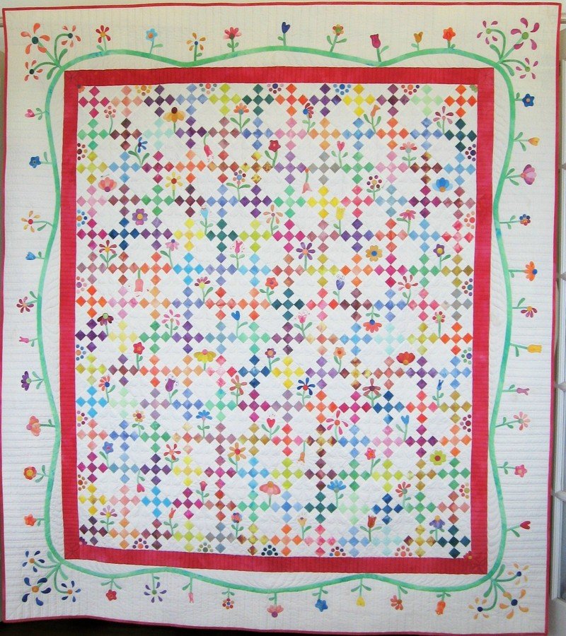 | Design Source - Description | Inspiration for quilt was to make a nine patch with a red border from my hand dyes. Applique of whimsical flowers added after quilt top completed. |
