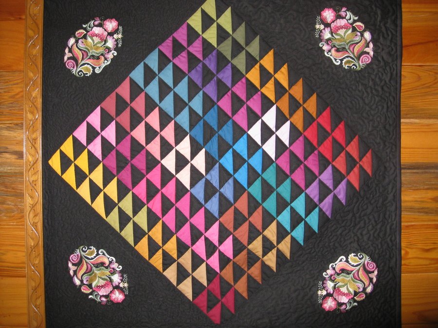 | Design Source - Description | A mix of Amish black and solids with added machine embroidery and stippling. I started hand quilting the triangles, then switched to machine quilting as my arthritis dictated. |