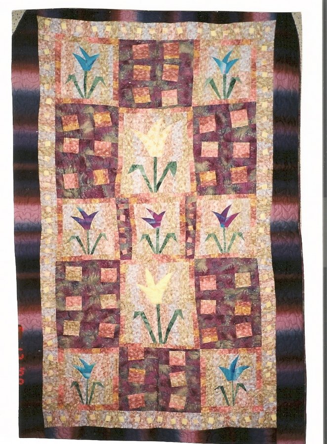 boothroyd A garden for Emma - This was made after taking two classes with Ricky Tims,my grand daughter liked the flower I made in the first class and wanted a bed quilt with them on. I then used the dancing blocks from the second class to design the quilt.