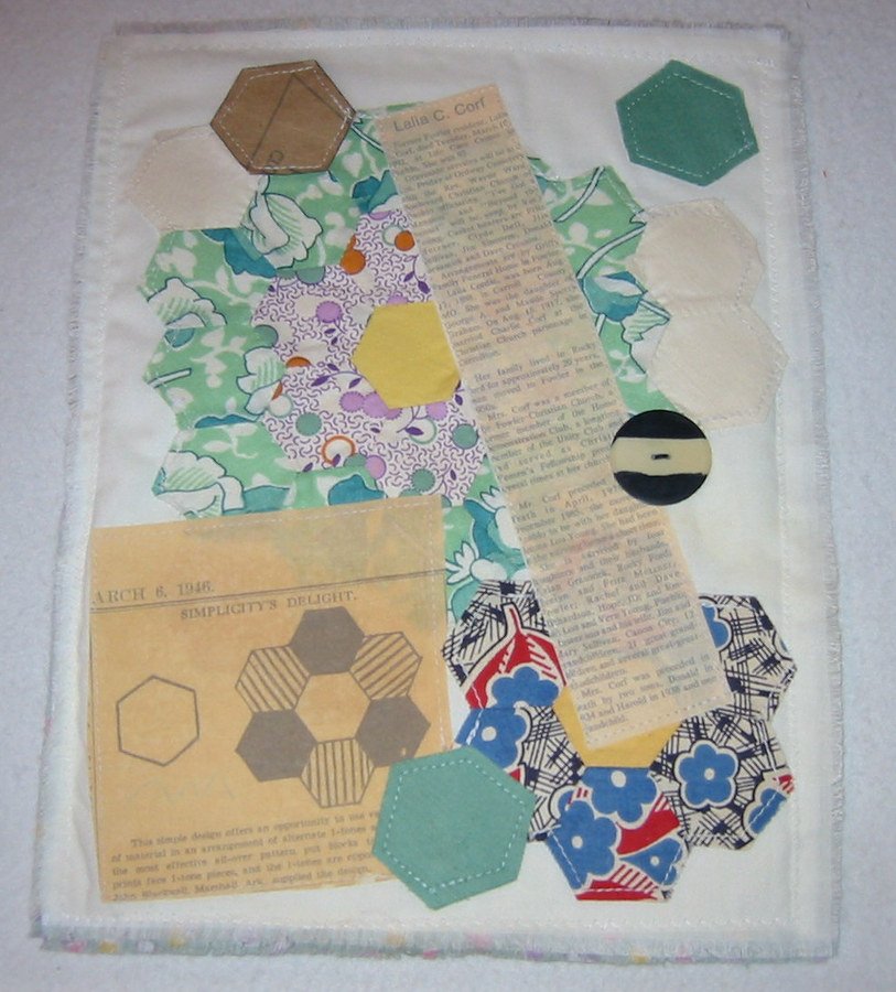 GrannyFran Lalia:Pieces of a Life - Back of previous journal quilt. The Grandmother's Flower Garden blocks were made by Granny. The hexagon template was her origainal one made of sandpaper, which I sewed on. Her pattern clipping and her obituary clipping were scanned and printed onto fabric and appliqued on.