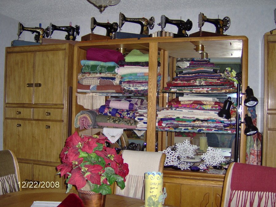 abayer07latx Stacks of quilts - This is how I display my the quilts that I've made since I've filled up all the walls and beds in the house! Part of my vintage sewing machine collection sits on top. I took the smoke glass doors off the china cabinet. I'd rather have a place to put my quilts. I donated the wedding china we NEVER used!