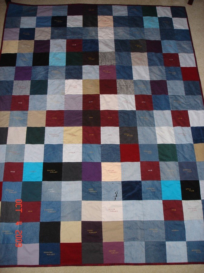 quiltycrafts Comforting Memories - Blocks are made from denim jeans, bib overalls from my parents (including worn and stained) and thrift store finds with select blocks embroidered with family names. Made as graduation gift for my niece to remind that she is loved.