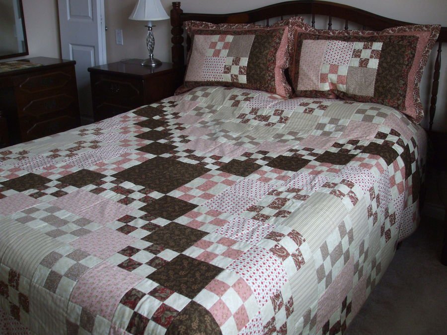 etafrica Wedding Nine Patch - This quilt was a gift to celebrate my son's wedding in July 2008. My daughter-in-law chose the fabrics and designed the combination of Nine Patches with plain 6 inch finished blocks. There are 256 blocks in total. I made the 2 pillow shams with left-over fabric.