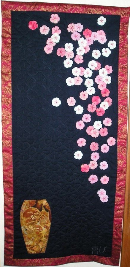 NeilC Spring in Kyoto - There is a Mount Fuji flowering cherry tree right next to the french windows which the table I quilt at is near and it inspired me to make this quilt last spring. Each of the blossoms are made up of 5 petals fused together on an applique mat and then en mass I sprinkled them onto the quilt top - I fused them where they fell and then stitched them in place. Although you can't see it in the photo the quilt is quilted in a traditional japanese quilt pattern.