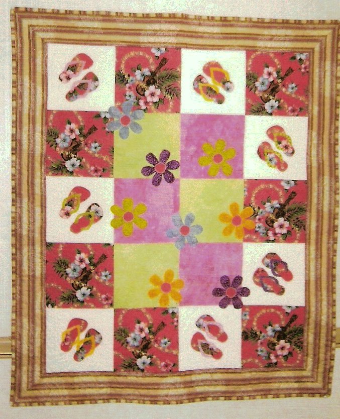 arlijohn Madison's Flipflops and Flowers - This baby quilt incorporates Hawaiian print and hand dyed fabric. Simple baby quilt made for friends. I designed quilt wanting to feature flipflops because I had seen some flipflop quilts and because I knew this would be an outdoor girl.