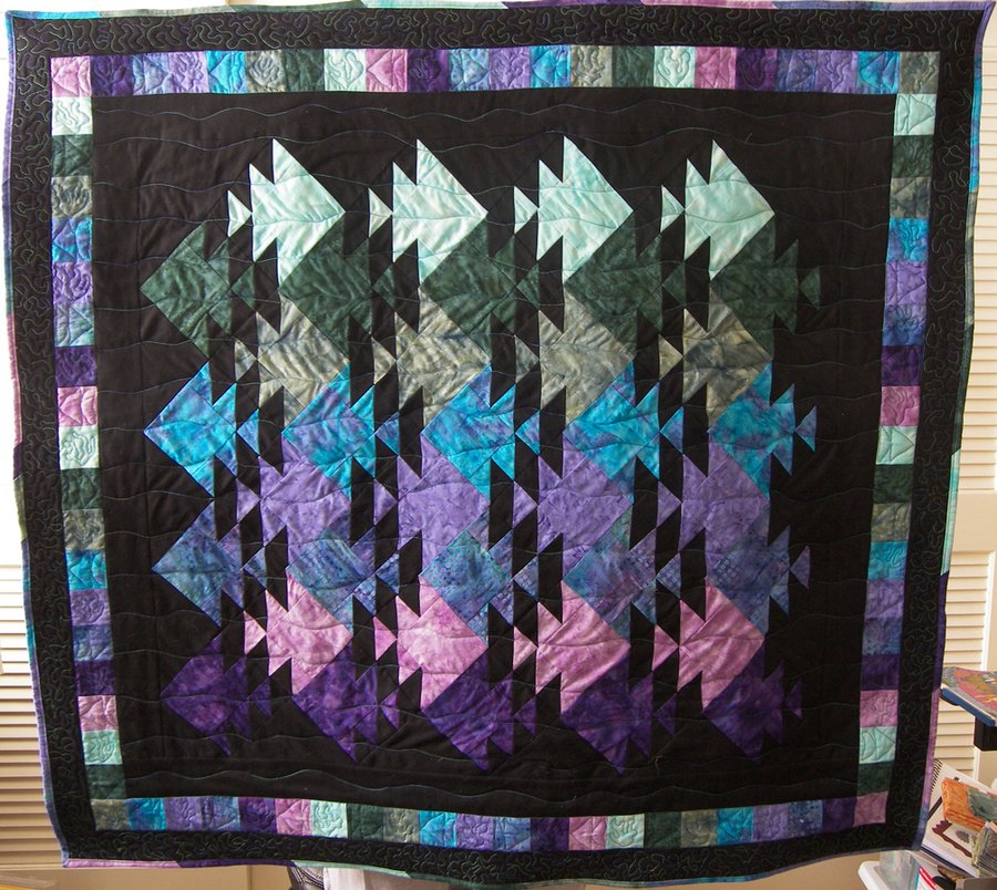 KarLynne Fish - The quilt featured in QNM was made by Debbie Boyd called "Gazing Into Clear Water". I loved the design and colors and didn't change the design except to make it a little smaller. This was my first quilt and I remember getting lots of helpful advice at my local quilt shop on how to make half-square and quarter square triangles. The help they gave me was invaluable since I was pretty much clueless at the time. Thank you to Mary at The Sampler in Chanhassen, MN.