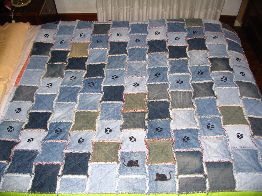 soynessy Rag del Escondite - Diseño original mio. Cosido, aplicado y acolchado a máquina. Podeis ver el recorrido del gato....????solo le queda saltar sobre los ratones. La delantera es de tela vaquera, usando pantalones viejos, las aplicaciones (huellas de gatos y ratones) son de tela vaquera con festón a maquina. El acolchado es a maquina solo en los bloques que no hay aplicación. My original design. Sewn , aplique and quilted by machine . You can see the trail of the cat is left alone ....???? pounce on the mice. The front is denim jeans using old applications (traces of cats and mice) are denim jeans with a machine buttonhole stitch. The back is flannel. The quilting machine is only in the blocks that are not aplique.