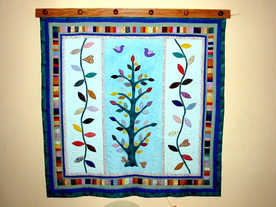 quiltsrfun Tree and Vines - This was a quilt I made to learn different applique methods. I used freezer paper, needle turn, and machine applique. It was also the first quilt that I quilted on a frame. The quilt was made in three panels. A piano style border using fabric pieces left from the leaves. It was hand quilted using echo quilting.