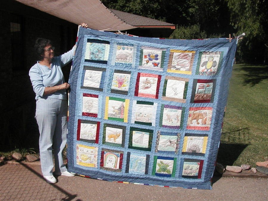 quiltsrfun Third Grade Animals - My third grade class wanted to make a quilt. We decided to make it an artistic one with each student using fabric crayons and drawing his or her favorite animal. I took various fabrics from my stash and let the students choose fabrics to border each block. Each student kept his/her block with threaded needles and border pieces in a zip lock bag. When they had free time, they pulled out their block and hand pieced it together. I sewed the blocks together. We put the quilt on a traditional frame balanced on chairs in the library and some parents and grandparents helped quilt it. The students agreed to auction off the quilt to benefit the Parents' Club. It was a great project!