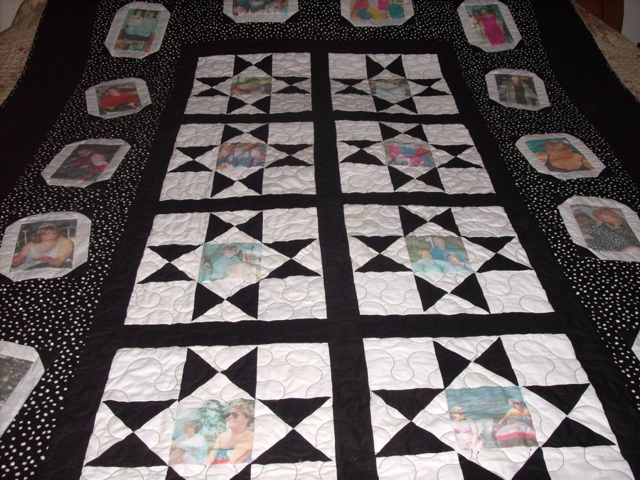 Barbiedoll Let The Good Times Roll - This quilt was made for one of the members of our Girls Nite Out group that have been friends for over 27 years. Last year we found out the youngest member of our group had cancer of the liver. I decided to make her a memory quilt using photos of some of our events that had taken place over the years. I asked each of the girls to write a message of encouragement (love) that I incorporated on the back of the quilt. On the front I used photo transfer squares for the center of the stars. We wanted our friend to wrap herself in the quilt and feel the love we felt for her during her recovery process. I don't know if the quilt made any difference but I am so happy to report that the latest news is very encouraging.