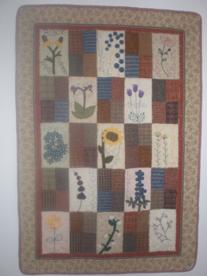 | Design Source - Description | A gift for my mother on her 80th birthday. It hangs in her lake home and needed to be somewhat rustic looking. The quilt duplicates the flowers surrounding her home. |