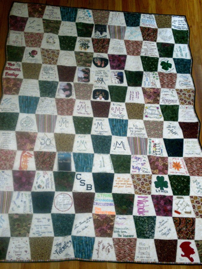 | Design Source - Description | Designed for my sister Kathy's 50th birthday surprise. Contributing blocks were designed by her family, neighbors and cancer support group. Kathy's faith to survive has beat all odds. |