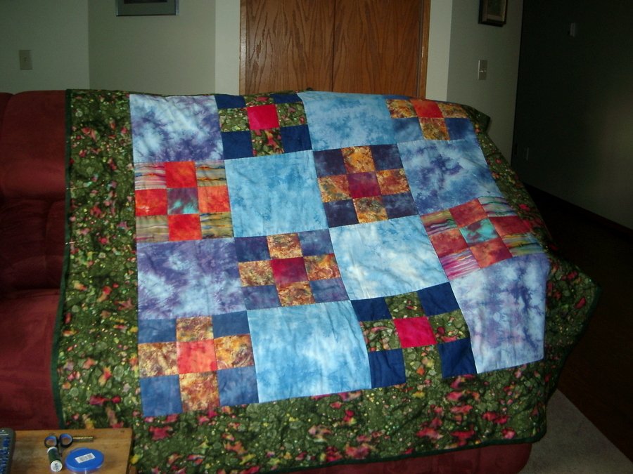| Design Source - Description | Hand dyes and batiks just inspire playtime and the result is a modified nine patch and square with both machine and hand quilting. |