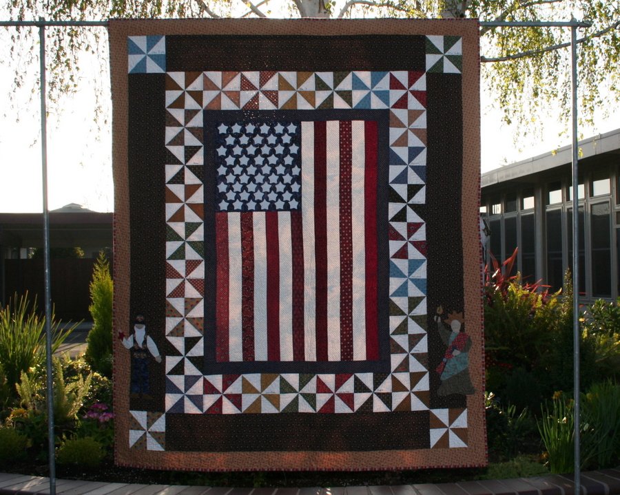 Capergirl God Bless America - The Applique designs came from Vintage Classics, Lisa DeBee Shiller and I adapted the pattern from the McCalls "A Nation's Pride" to fit all of the children's pinwheel blocks . The 3rd Graders picked out reproduction Civil War fabrics from my collection and we sewed together using thangles (so easy). I sewed the center flag and they placed their signed squares around it. Borders were added and the applique designed sewn on. The back of the quilt had a reproduction print of the Declaration of Independence. This quilt was sold at our Saint Francis of Assisi School Auction.