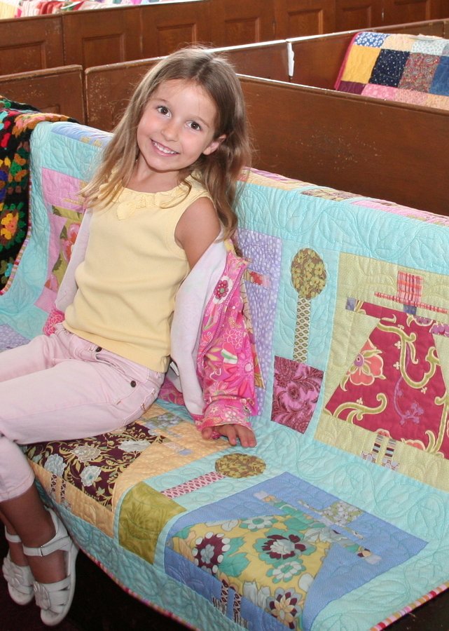 Capergirl Garden Party Ladies - My daughter sits proudly on our quilt when it was at a show in Sydney, Nova Scotia during a visit "home". I took a fun class with Freddy Moran but I wanted to make the pattern my own and the bold colors in Freddy's quilts didn't suit my decor so I decided to sew my ladies in soft tones and prints. I think it turned out adorable and hangs proudly in my home. Kathy Sandbach did an amazing job of machine quilting and even free motioned purses and veggies in their hands.