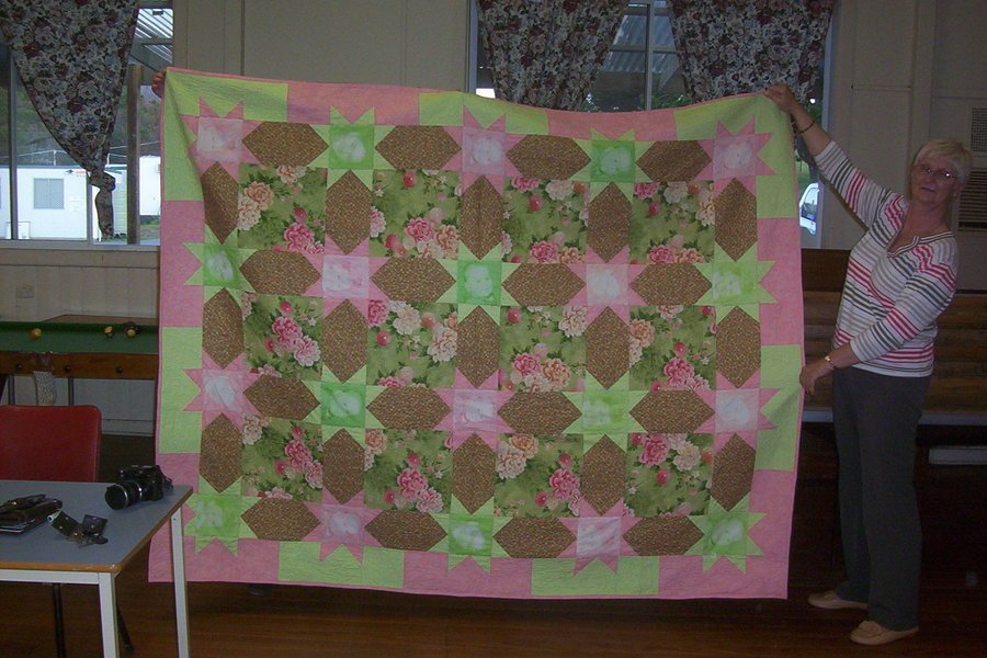 victoriaedm Rebecca's 21st - This quilt was made for my stepdaughter's 21st. I used ohio stars in the sashing to frame pictures of rebecca and a beautiful japanese fabric in the blocks. When I created the pictures, I altered the colour balance so that the pic matched the stars and toned down the photos so they were not "in your face" like many photo quilts. The quilt was quilted (by me, on my homemade longarm) with a variegated thread that included all the colours of the quilt, with large roses in the large blocks. I finished by also framing the pictures with a pointed satin stitch. The quilt is quite large, and I am very pleased with the way it all went together.