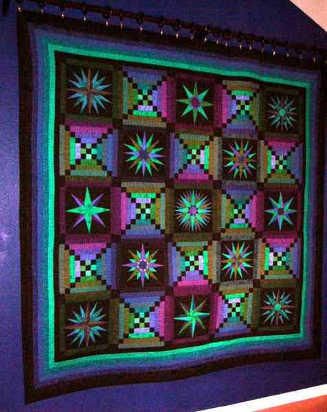 hummerlou "MoonGlow" - "MoonGlow" was a quilt kit I admired the moment Jinny Beyer put it on the market. We bought the kit at a local quilt store when it went on sale and it set in my sewing room for awhile. I guess I was afraid of the piecing, but eventually got started. Now it is a treasure that I have dedicated to my husband for all of his love and support.