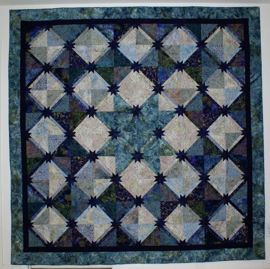 Ibquiltn2 Reach for the Stars - This quilt was made for my son Josh in honor of his 21st birthday. I wanted to create the appearance of a marble checkerboard style floor with fossil inclusions showing in the stone.