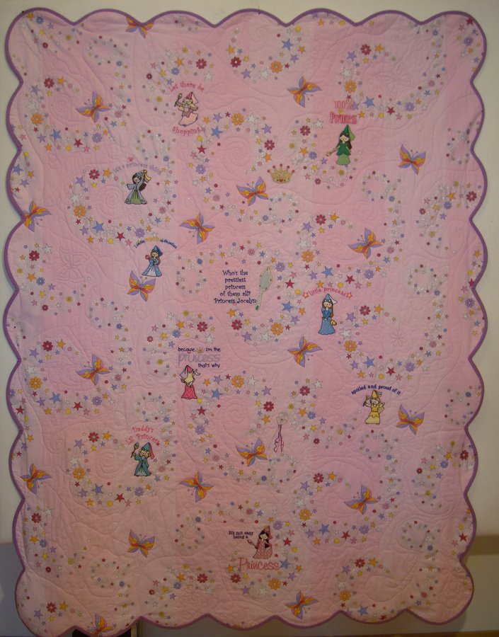 | Design Source - Description | Little princesses with appropriate sayings machine embroidered on wholecloth fabric. Machine quilted in random swirls, butterflies, & flowers. Edges scalloped and binded with bias strips. |