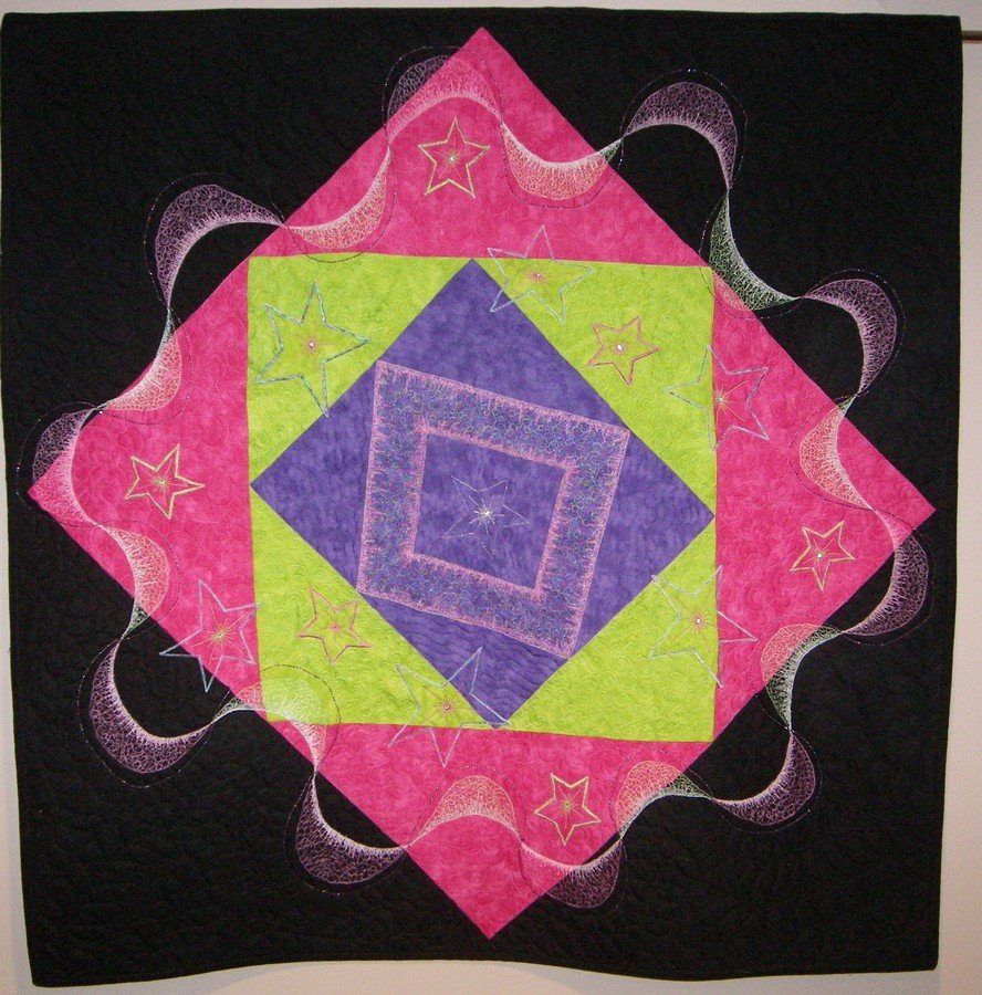 | Design Source - Description | Square in square, with thread play and thread applique. Embellished with cyrstals. Machine quilted. Inspired after attending the Ricky Tims Super Seminar. |