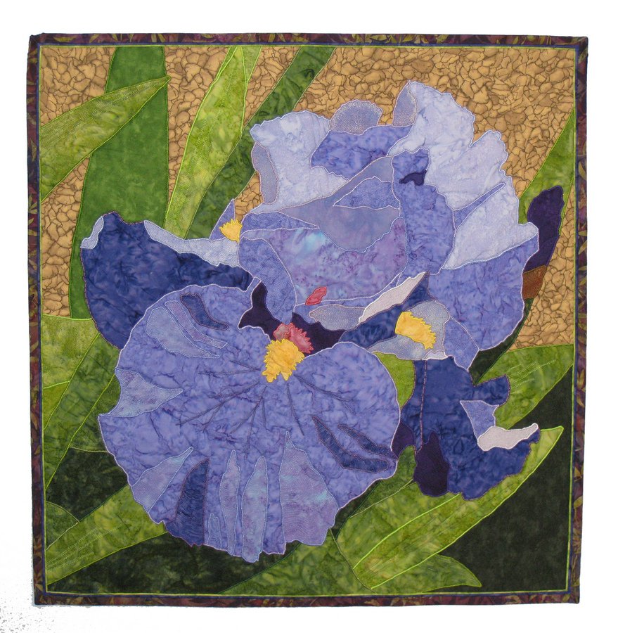 jpotteraz Purple Iris - Irises are my favorite flower and they were everywhere when I was in Paducah last year. I took several pictures and then cropped and edited this single iris to use for my pattern. I tried some new techniques such as satin stitched edges instead of raw edge applique. I also used a double piping on the bound edges. It has a lot of thread embellishment.