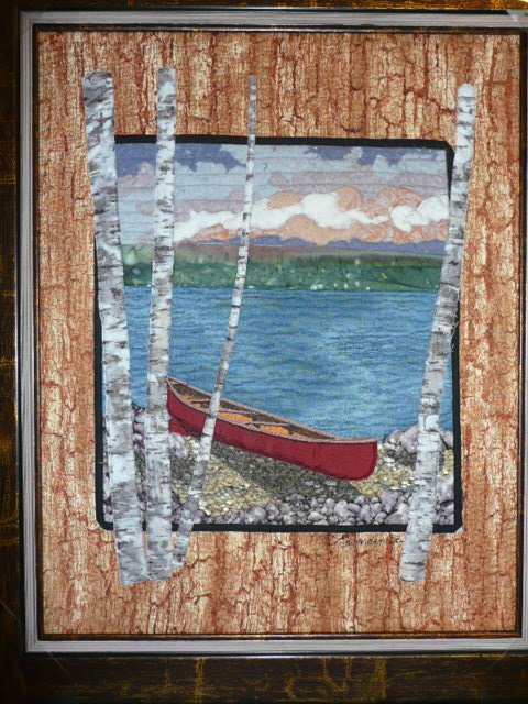 My challenge for this quilt was to completely make the sky up using only dryer lint! I built the canoe out of 3 different fabrics. |