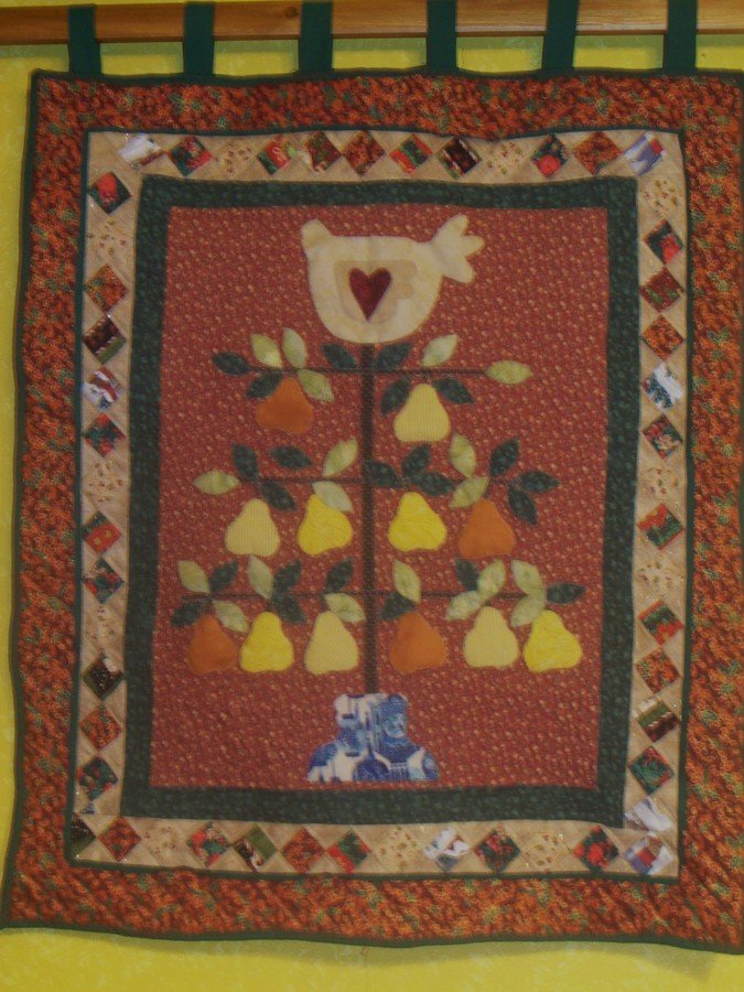 crazyladyw8 Partridge in a pear tree - I seen this wall hanging in the magazine and knew I had to make it for my dining room. I did not have the exact fabrics used so I just used what I did have . I collect blue willow dishes so I had to have my tree in a blue jar. I changed to borders to diamonds and used Christmas prints. I used a green " crumb catcher" to give it depth, between the borders.